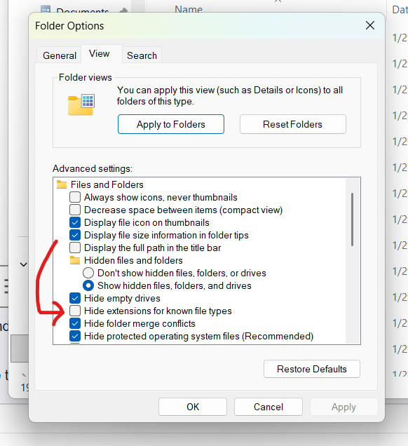 Go to explorer and then thee … menu, and choose options and uncheck “Hide Extensions of Known File Types”